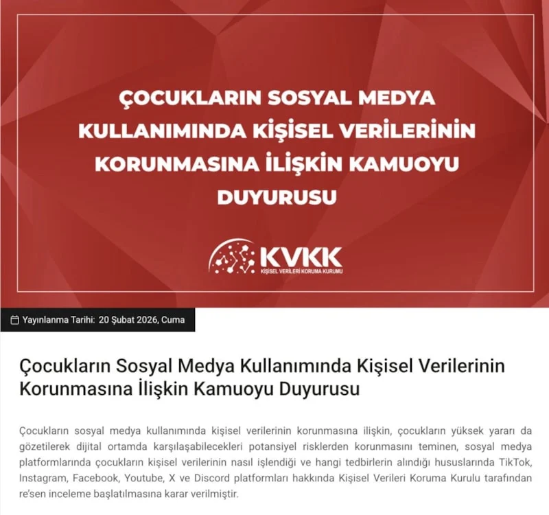 Çocukların dijital ortamda karşılaşabilecekleri potansiyel risklerden korunmasını teminen sosyal medya platformlarında çocukların kişisel verilerinin nasıl işlendiği ve hangi tedbirlerin alındığı hususlarında TikTok, Instagram, Facebook, YouTube, X ve Discord platformları hakkında Kişisel Verileri Koruma Kurulu tarafından resen inceleme başlatılmasına karar verilmiştir.