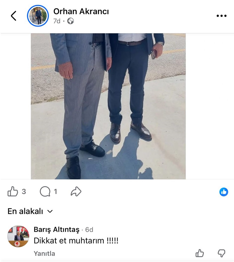 Etkinliğe katılanlara yönelik teşekkür mesajları paylaşan Muhtar Akrancı’nın sosyal medya gönderisinin altına Efeler Belediyesi’nde sadece Park ve Bahçelerden sorumlu olan Belediye Başkan Yardımcısı Barış Altıntaş’ın tehdit mesajı damga vurdu.