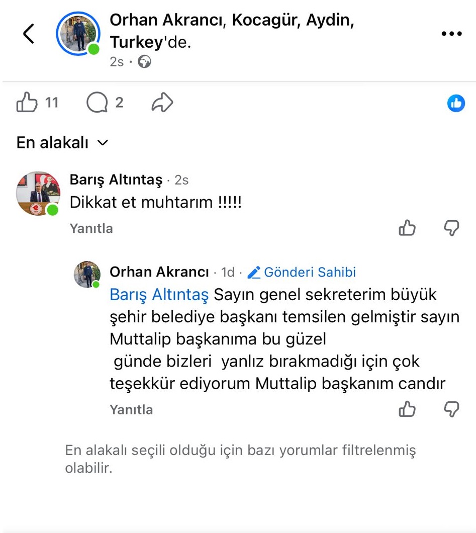 Kocagür Mahalle Muhtarı Orhan Akrancı’nın Aydın Büyükşehir Belediyesini etkinliklerde temsil eden Genel Sekreter Yardımcısı Muttalip Özsemerci’ye yönelik teşekkür mesajının ardından yaşananlar bu kadar da olmaz dedirtti.