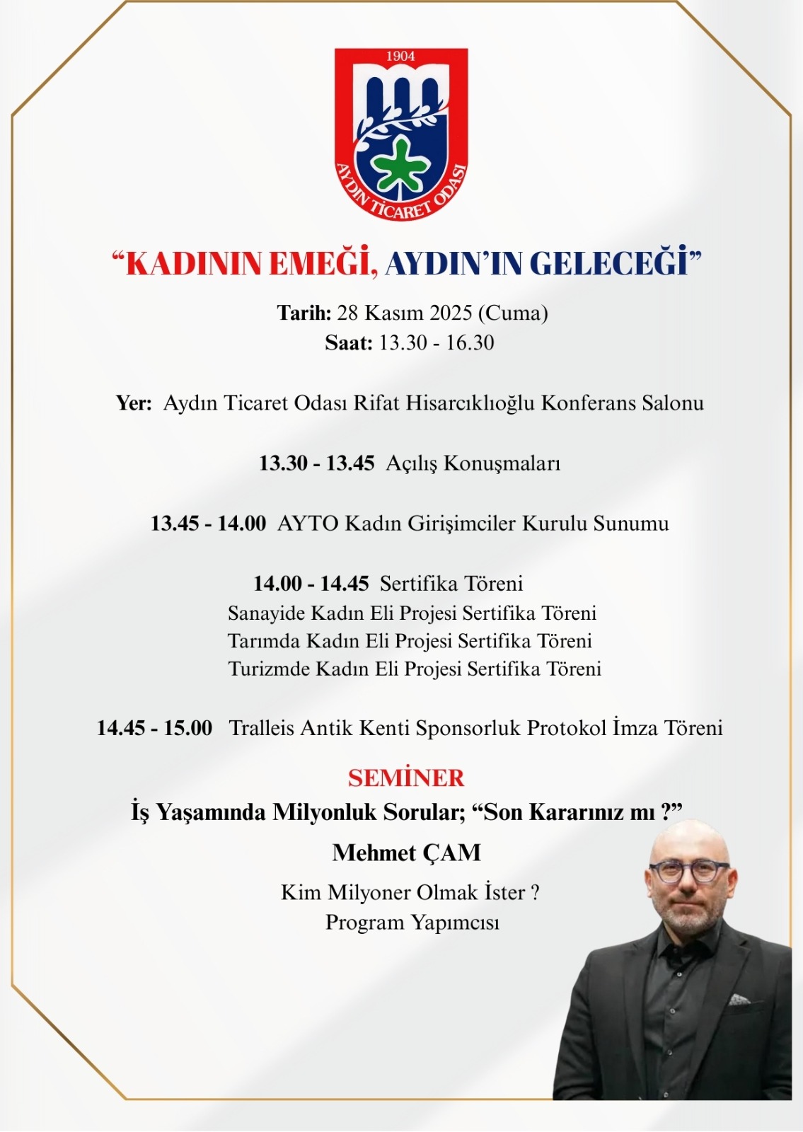 Programın devamında Kim Milyoner Olmak İster yarışmasının yapımcısı Mehmet Çam, “İş Yaşamında Milyonluk Sorular; Son Kararınız mı?” başlıklı semineriyle katılımcılara ilham verecek.