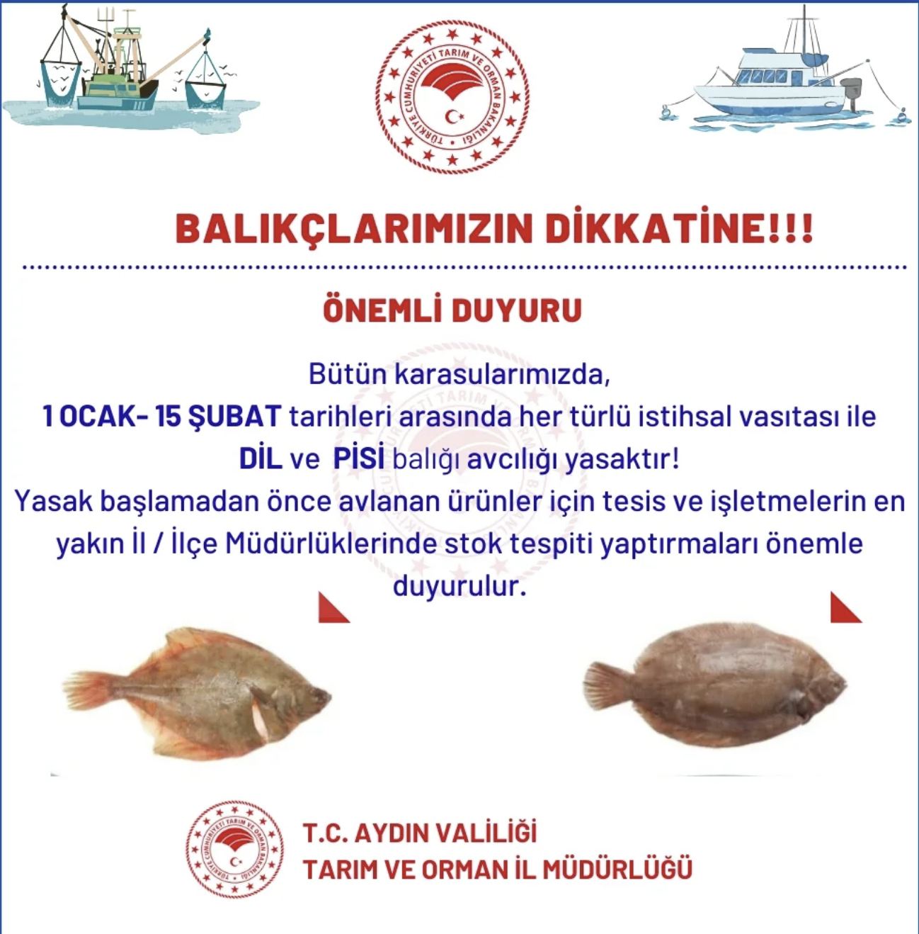 İl Müdürlüğü tarafından paylaşılan duyuruya göre; bütün karasularımızda 1 Ocak – 15 Şubat tarihleri arasında her türlü istihsal vasıtası ile Dil ve Pisi balığı avcılığı tamamen yasaklanmıştır.