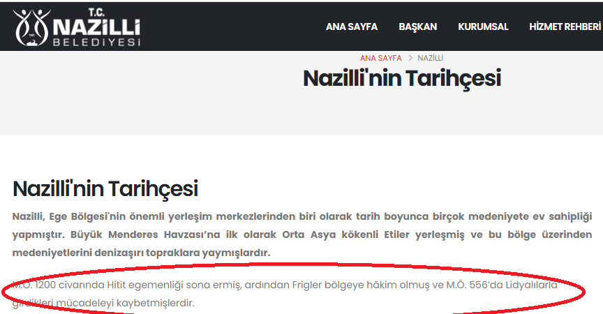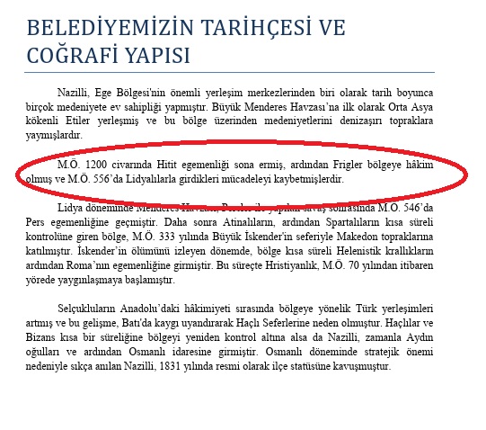 Nazilli’de ilk yerleşimi Etiler Medeniyeti’nin kurduğunun savunulmasını tartışmaya açmaya değer görmeyip bir kenara bıraksak bile, Ege, İon, Helen ve en son Türk Medeniyetine dair hiçbir ayrıntılı bilginin yer almamasının yanında, yaklaşık 700 yıllık uzun bir dönemin Frigler-Frigyalılar tarafından yönetildiği açıkça yazmaktadır.