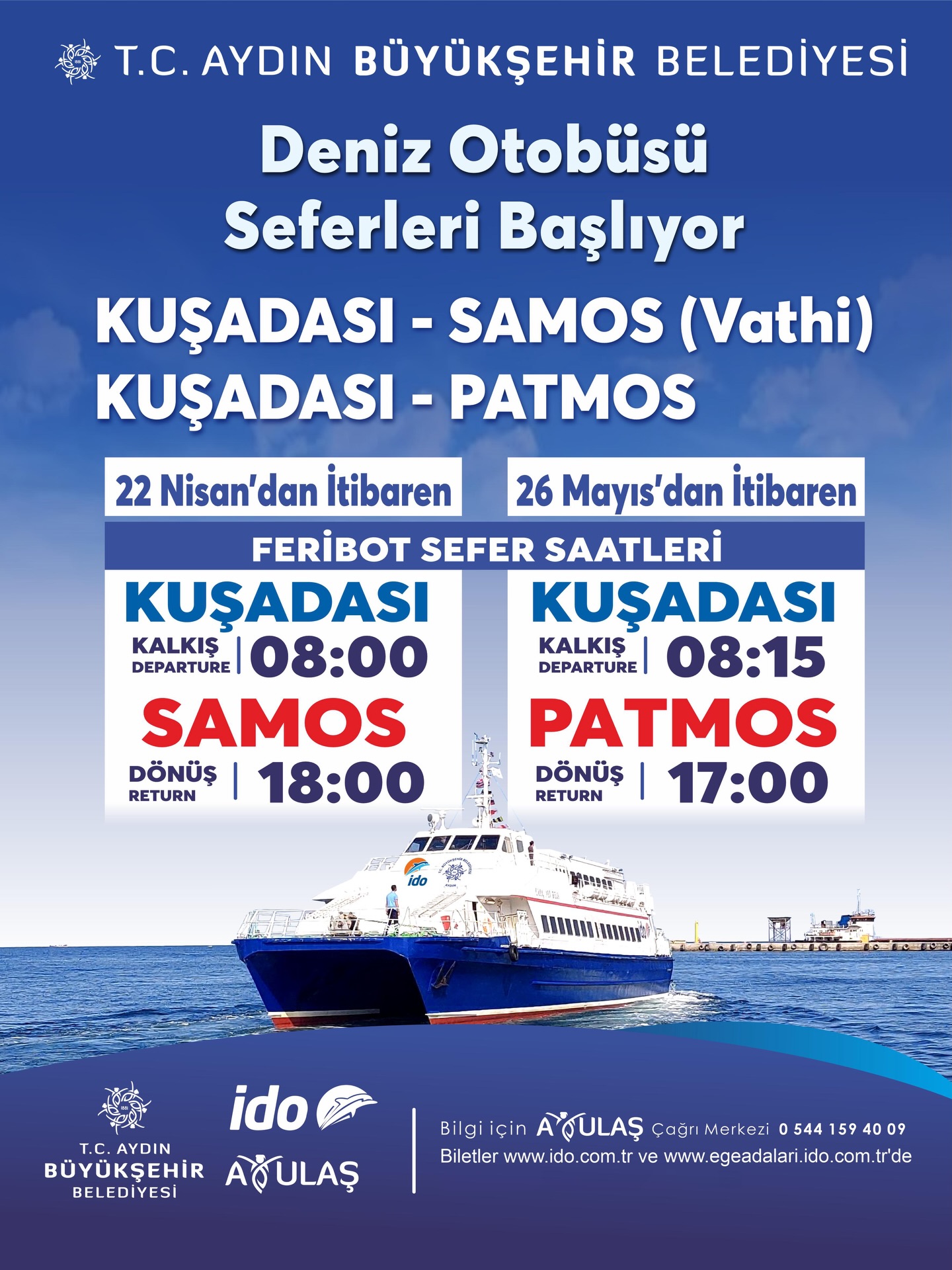 Kuşadası çıkışlı Yunan adalarına deniz ulaşımı sezonun gelmesiyle tekrardan başlıyor. Aydın Büyükşehir Belediyesi’nin duyurusuna göre, yaz sezonu öncesi Samos Adası’na (Vathi) 22 Nisan’da ve Patmos Adası’na ise 26 Mayıs’ta seferlerin başlayacağı duyuruldu.