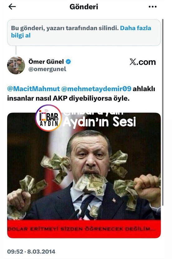 Kuşadası Belediye Başkanı Ömer Günel, X(eski adıyla Twitter)’te yaptığı paylaşımda Erdoğan’ın ağzından ve kulaklarından dolar çıkan bir resmi paylaştığı, paylaşım fotosunda “Dolar eritmeyi sizden öğrenecek değilim..” ifadelerinin yazdığı, gönderi paylaşım kısmına ise “Ahlaklı insanlar nasıl AKP diyebiliyorsa öyle” yazıldığı görüldü.