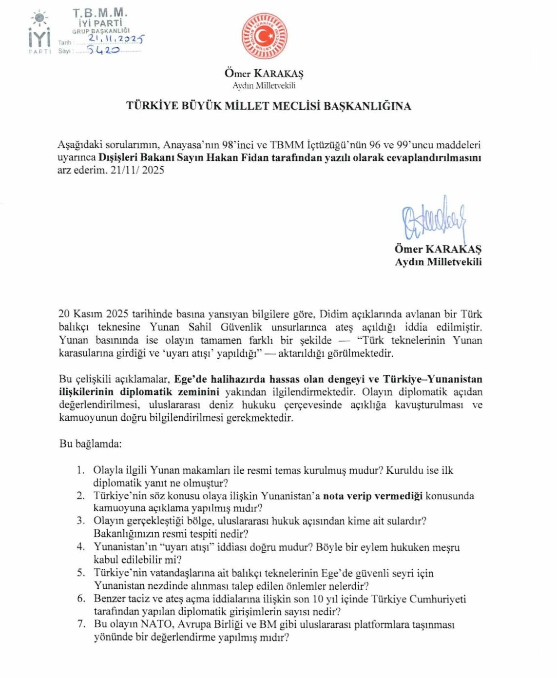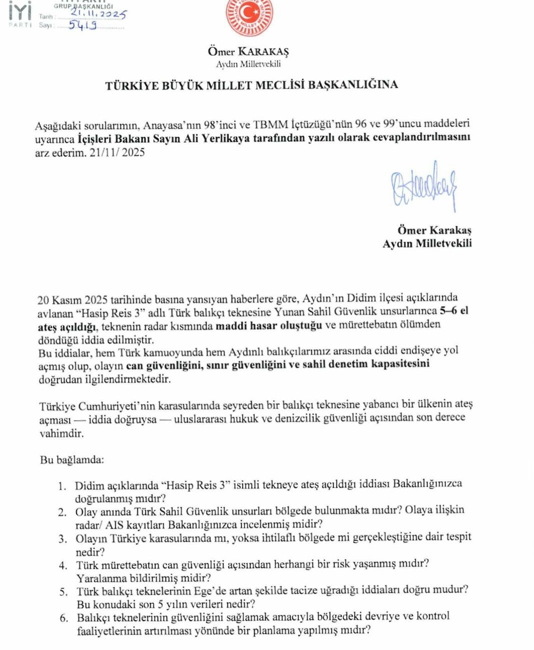 İYİ Parti Aydın Milletvekili Ömer Karakaş, Didim açıklarında avlanan bir Türk balıkçı teknesine Yunan Sahil Güvenlik unsurlarınca ateş açılmasını “son derece vahim” olarak nitelendirerek, olayla ilgili hem İçişleri Bakanlığı’na hem de Dışişleri Bakanlığı’na soru önergeleri verdiğini açıkladı. Olay, 18 Kasım gecesi Ege denizinde meydana geldi. Yaşanan olayda, Didim Taşburun Balıkçı Barınağı’ndan avlanmak üzere denize açılan “Hasip Reis 3” adlı tekneye, Didim açıklarında Yunan Sahil Güvenlik ekiplerinin 5 el ateş açtığı açıklandı.