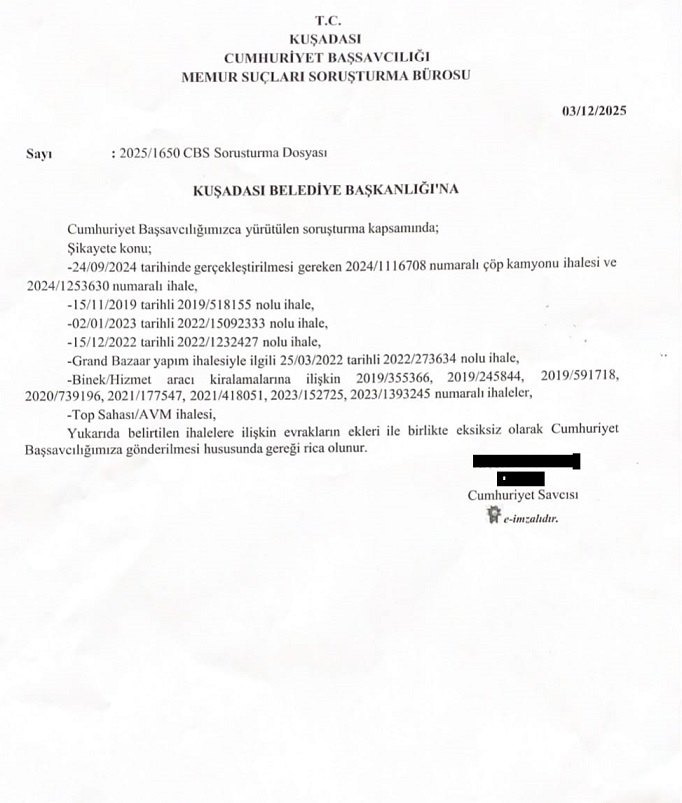 Kuşadası Cumhuriyet Başsavcılığı tarafından 03 Aralık 2025 tarihinde Kuşadası Belediyesinden EKSİKSİZ TÜM İHALE DÖKÜMANLARININ İSTENDİĞİ 14 dosyanın 10 tanesinin Aziz İhsan Aktaş Suç Örgütüyle iltisaklı aynı ortakların sahibi olduğu 4 şirkete ait olduğunu İhbar Aydın olarak duyurmuştuk.
