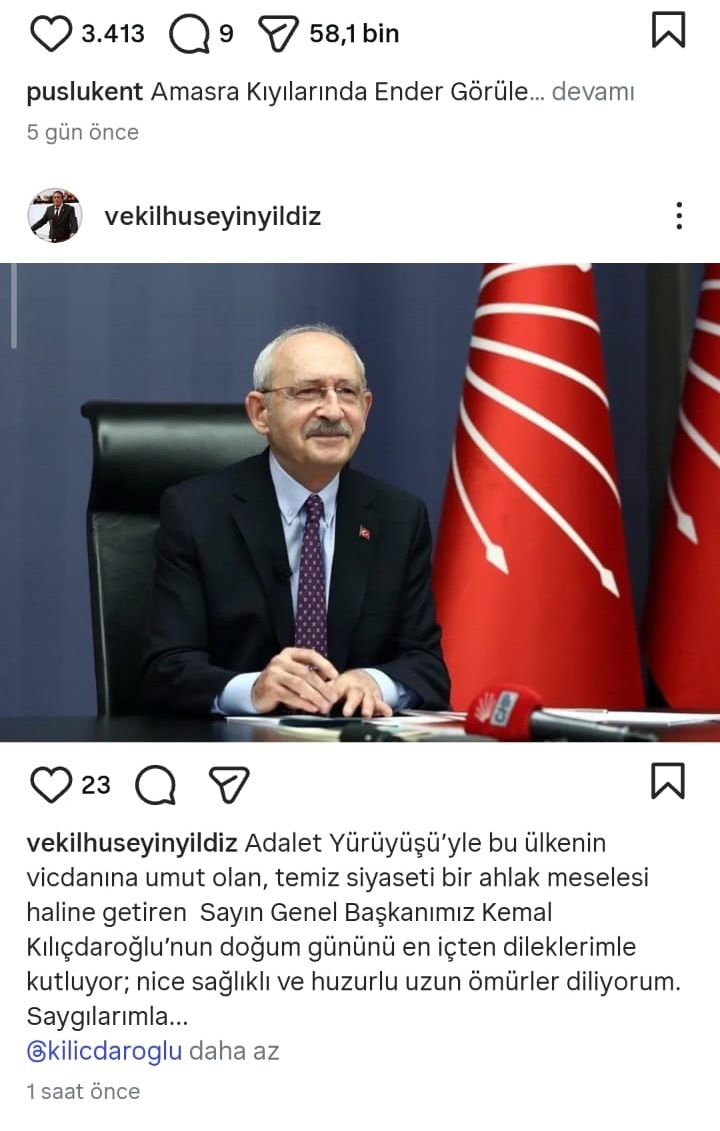 Bugün ise Vekil Hüseyin Yıldız, Kemal Kılıçdaroğlu’nun doğum gününe ilişkin sosyal medya üzerinden bir mesaj yayınladı. Aydın’daki siyasetten kendini geri çeken Yıldız’ın “temiz siyaset ve ahlak vurgusunun” CHP’nin parti içine mesaj olduğu konuşulmakta.