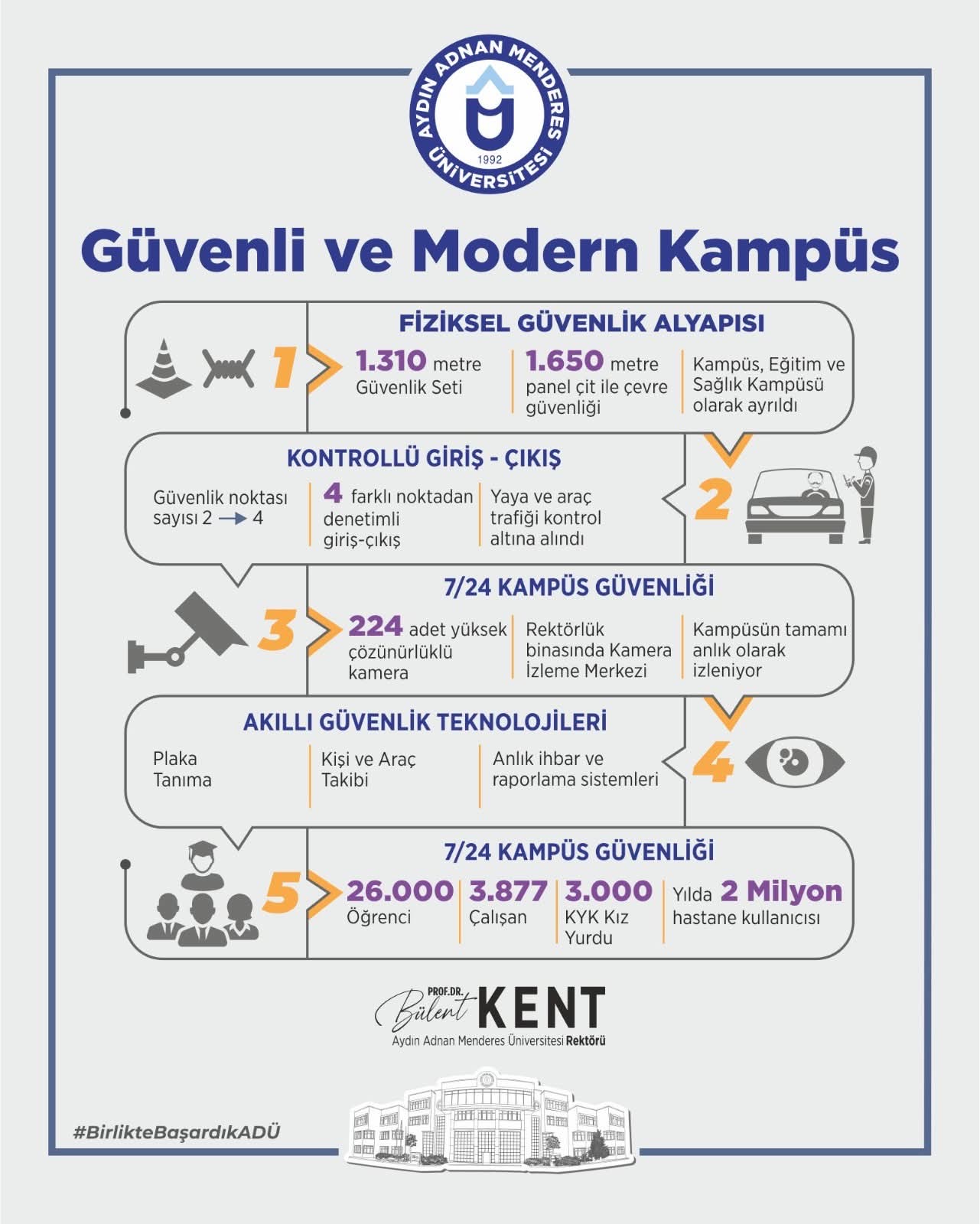 Aydın Adnan Menderes Üniversitesi’nde yaklaşık 26 bin öğrenci, 3 bin 877 çalışan ve yıllık 2 milyon ziyaretçi kapasitesine hizmet veren kampüste, son üç yılda yapılan yatırımlarla güvenlik ve altyapı baştan sona yenilendi.