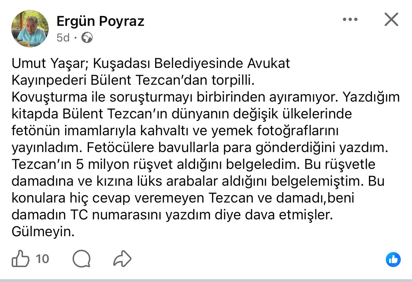 Yazar Poyraz, yaptığı paylaşımda “Umut Yaşar; Kuşadası Belediyesinde Avukat Kayınpederi Bülent Tezcan’dan torpilli. Kovuşturma ile soruşturmayı birbirinden ayıramıyor. Yazdığım kitapta Bülent Tezcan’ın dünyanın değişik ülkelerinde fetönün imamlarıyla kahvaltı ve yemek fotoğraflarını yayınladım. Fetöcülere bavullarla para gönderdiğini yazdım”, ifadelerini kullandığı görülmüştü.
